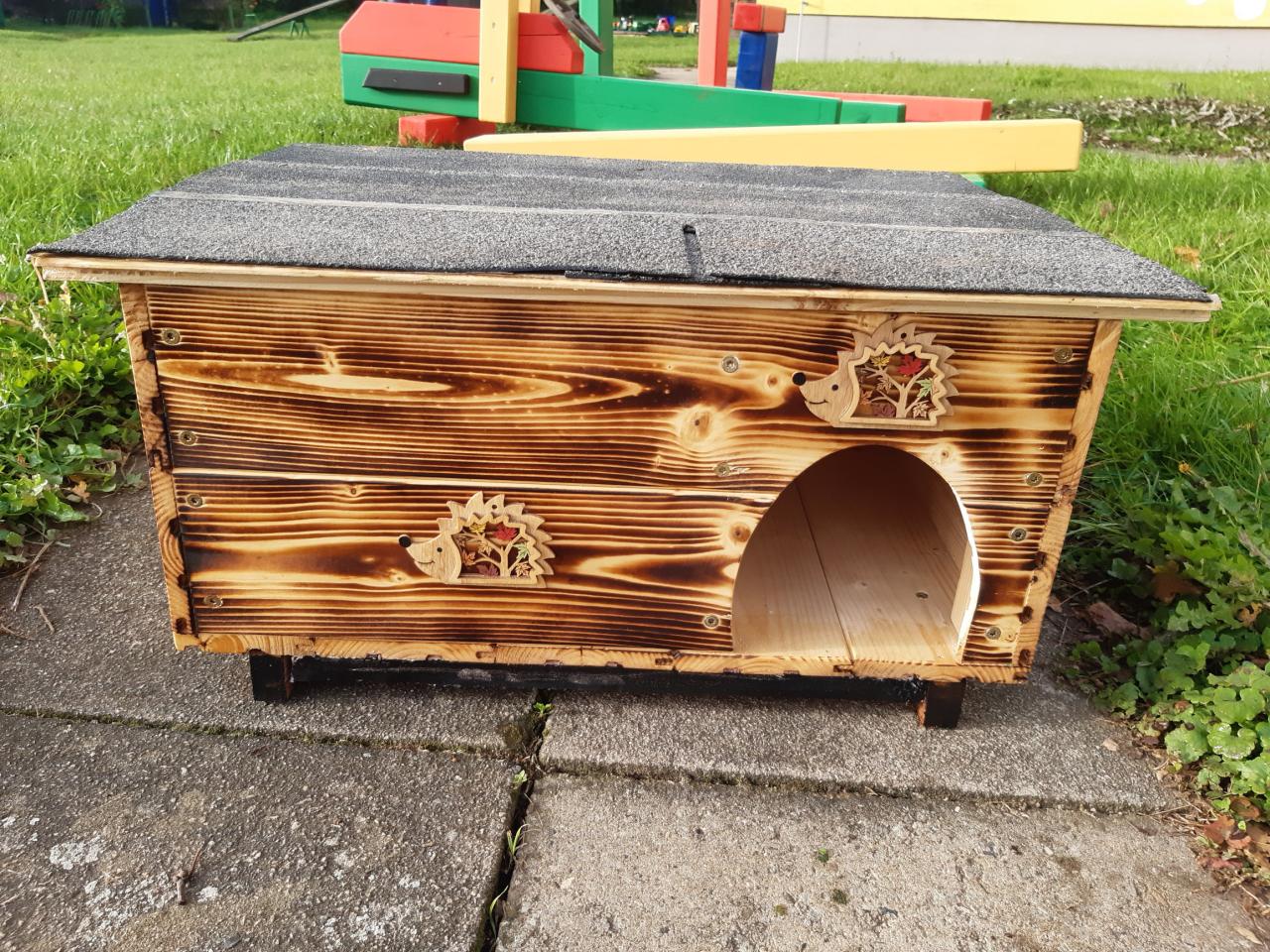 K tomu nám ještě věnoval domeček pro ježka, děti jej vystlaly senem, přidaly pár granulí a zabudovaly na zahradě. Teď už jen budeme pozorovat, zda se u nás nějaký ježek zabydlí.